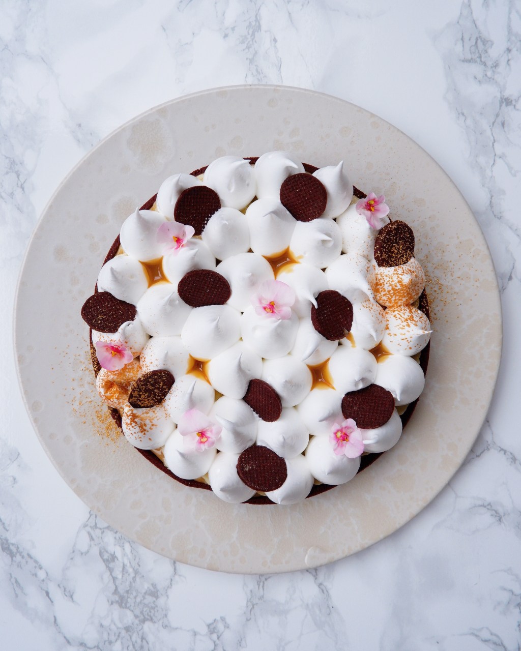 Fyld tærtebunden halvt op med karamel. Fordel bananskiver i et fint lag ovenpå. Sprøjt marengsen i toppe ovenpå bananerne. Marengsen kan eventuelt brændes med en gasbrænder.