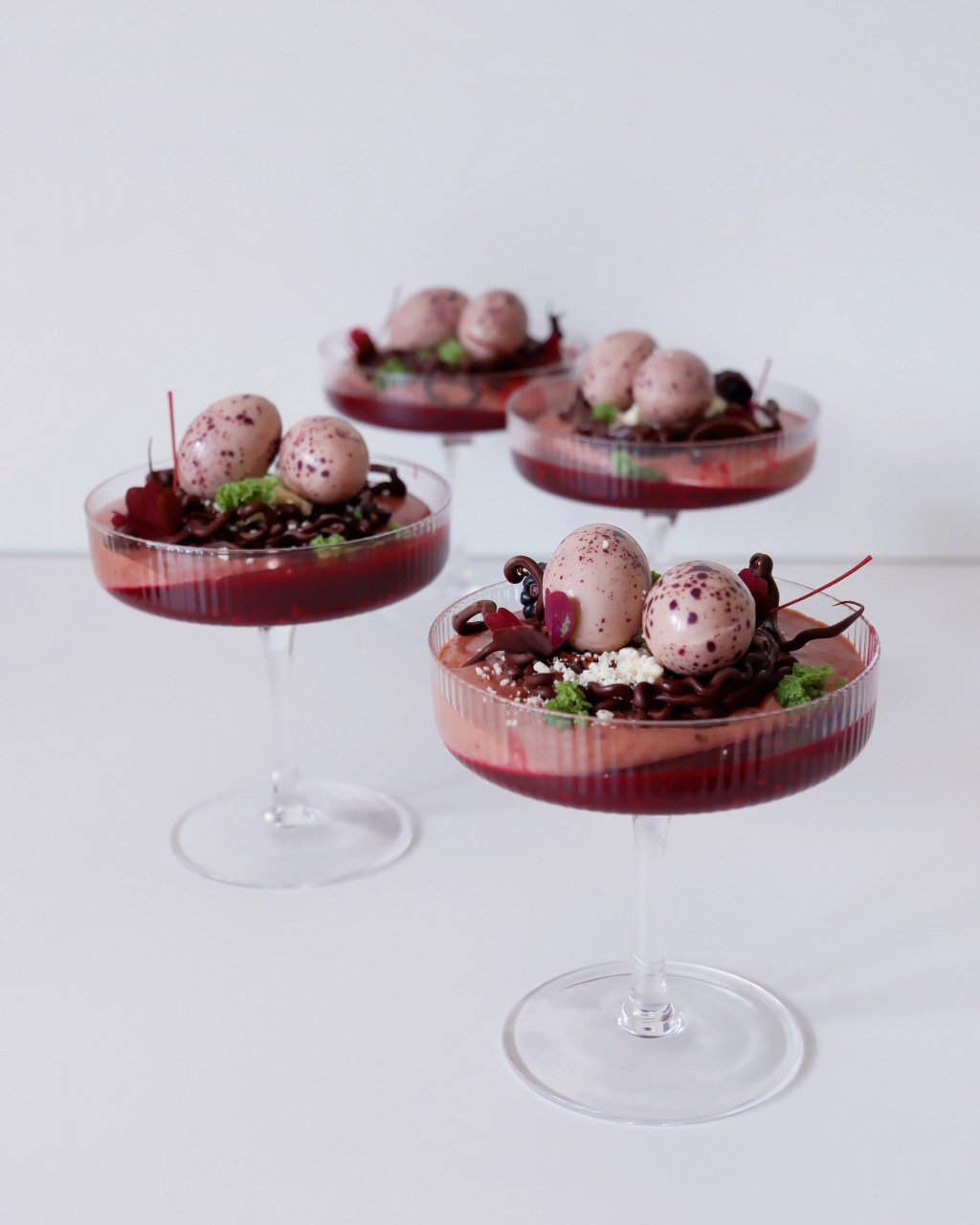Placér de mundrette stykker brownie i den satte mousse og gelélag. Herefter chokoladerederne, krystalliseret hvid chokolade og æg. Pynt til sidst desserterne med skovsyre, mos og lidt friske brombær.